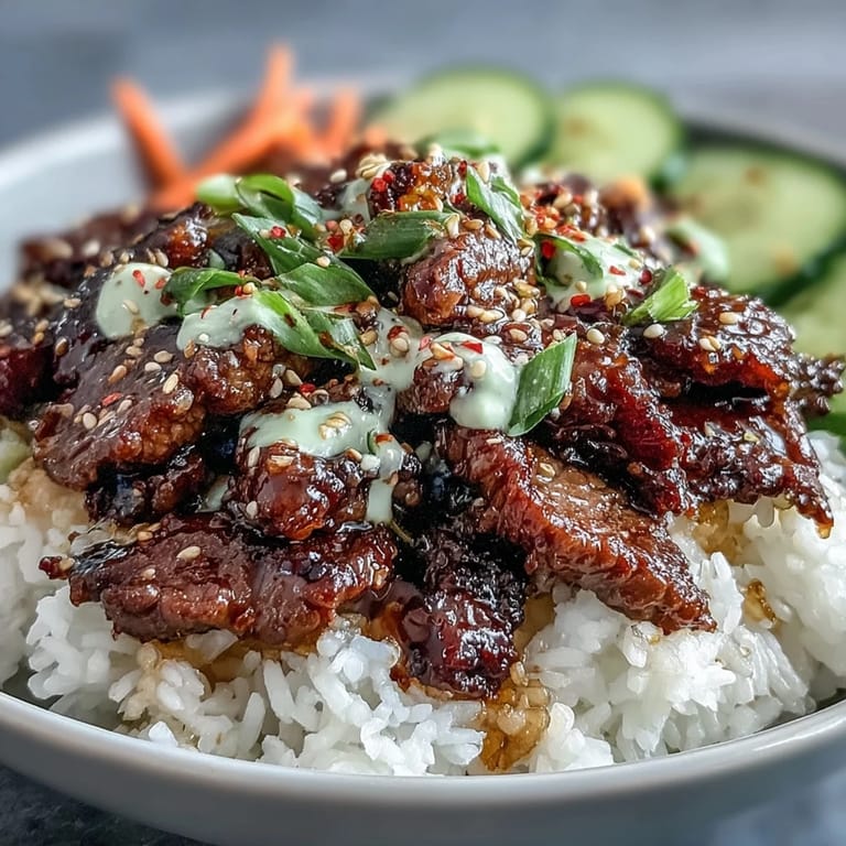 Save Brighten up your dinner routine with this vibrant Korean Beef Power Bowl. This protein-packed dish features tender, sesame-ginger marinated steak served over a bed of fluffy rice, balanced by the crunch of tangy pickled carrots and crisp cucumbers. Finished with a drizzle of creamy sriracha mayo, it is a restaurant-quality meal you can easily make at home.