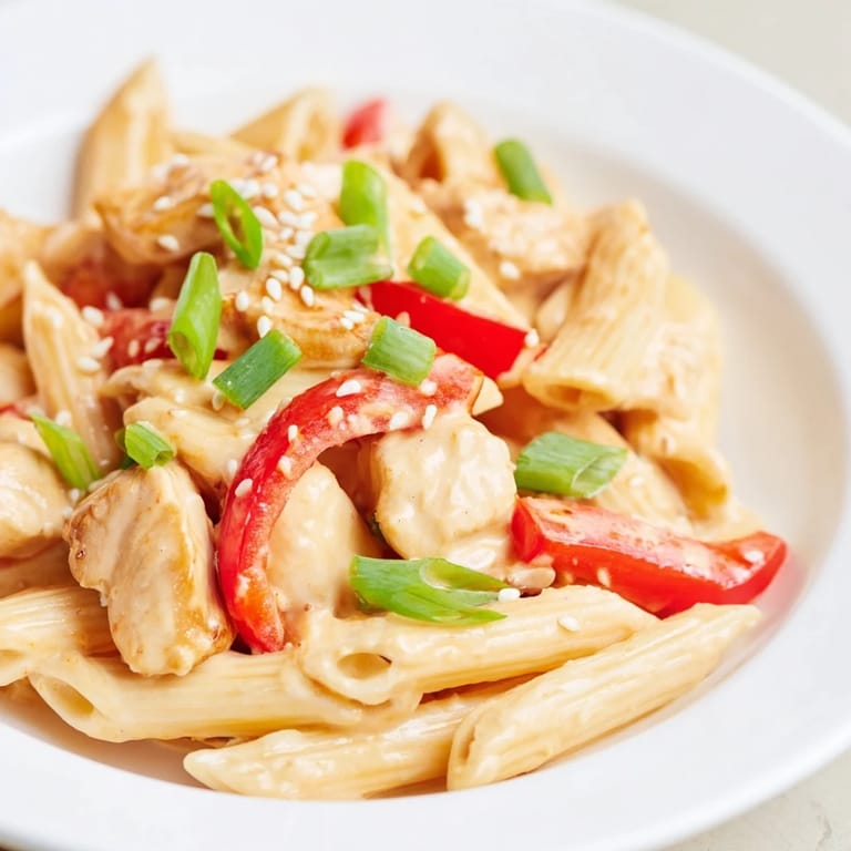 I've made this with shrimp when chicken wasn't in the fridge, and it cooked even faster, just a couple of minutes per side. Tofu works beautifully too, especially if you press it well and pan fry it until the edges get crispy. You can also swap the penne for rice noodles if you want to lean more into the Asian side of this fusion, just adjust the cooking time and keep an eye on the texture. If you're not a fan of bell peppers, try snap peas or broccoli florets, they both hold up well and add a nice crunch.